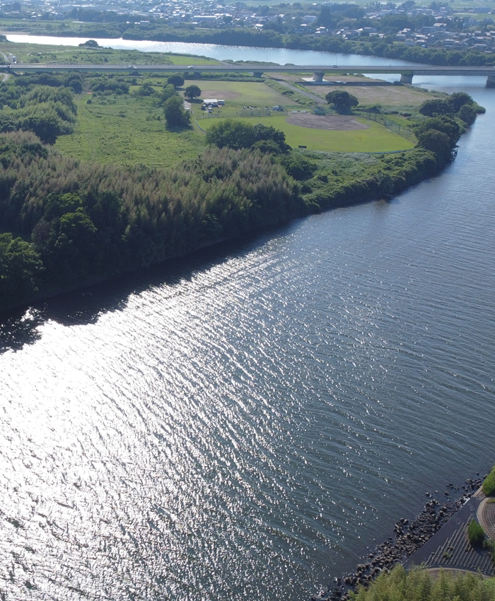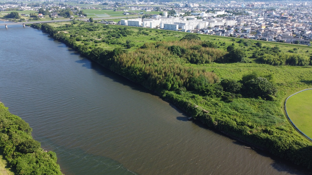 本工事は、那珂川の洪水時における安全な流下と水位低減を図る目的で、若宮町(那珂川右岸側)において河道掘削を行います。河道掘削とは、川の水が流れる水路(河道)を掘って広げたり、川底を掘り下げたりすることで、川が流すことのできる水量を増やし、洪水を防ぐことができます。また、青柳町(那珂川左岸側)において堤防養生工を施工します。河川の環境整備や保全のために行う工事です。
